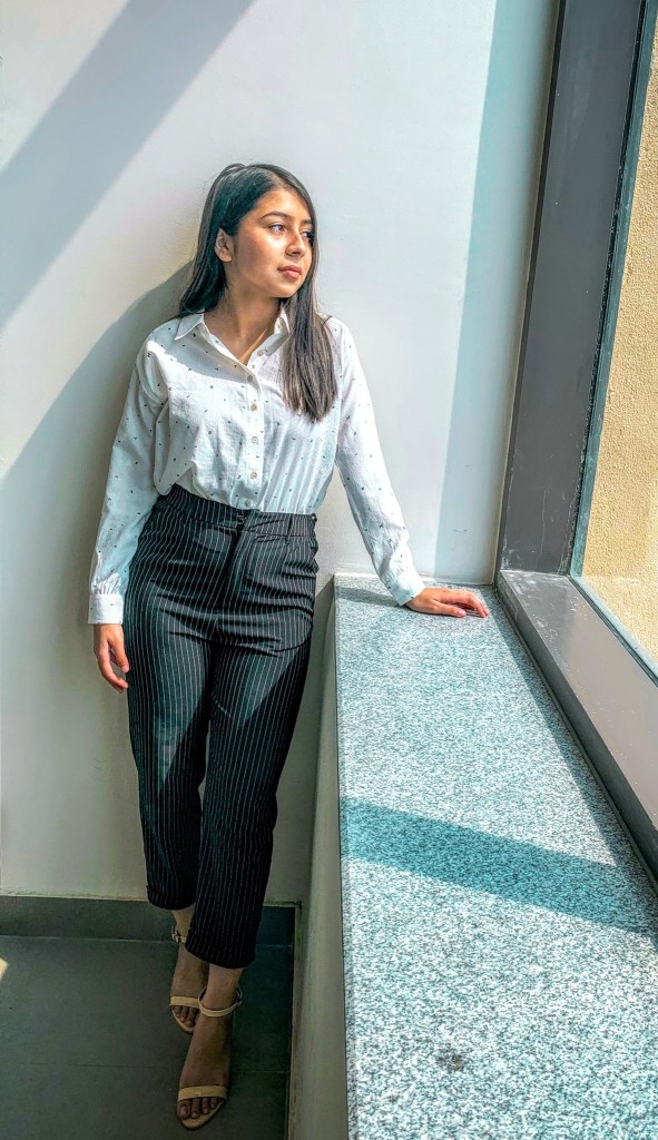 Ladies who are not skirt enthusiasts can simply go for the trousers ranging from shades of off white-to hazel-to black. A full sleeved tucked in top or light shirt would go well with these. If tight pants are also not your deal, loose khakis of checks or stripes can complement a smart body-hugging top well, along with an optional long shrug to bring the ‘let’s get down to business’ feel.